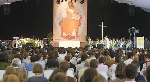 Een paar duizend mensen nemen plaats en het voornaamste 'programma' van de dag: de Eucharistie wordt meestal aan het eind van de morgen gevierd.De Heilige Mis wordt beschouwd en beleefd als het hoogtepunt van de dag..... en dat ervaar je meteen aan de verzorging van de liturgie door zang, symbolen, aandacht voor de lezing uit de H.Schrift en de verkondiging.