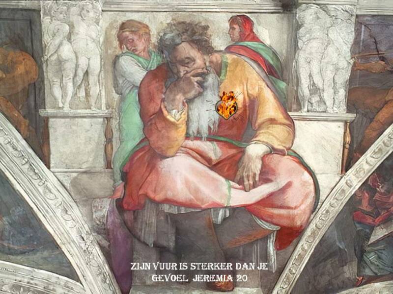 “Soms denk ik dan: Ik wil er niets meer van weten, niet profeteren, ik spreek niet meer in Gods Naam. Maar dan laait er een vuur in me op, in mijn hart, het brandt in mijn gebeente. Ik doe alle moeite om het in bedwang te houden, maar het lukt me niet.”