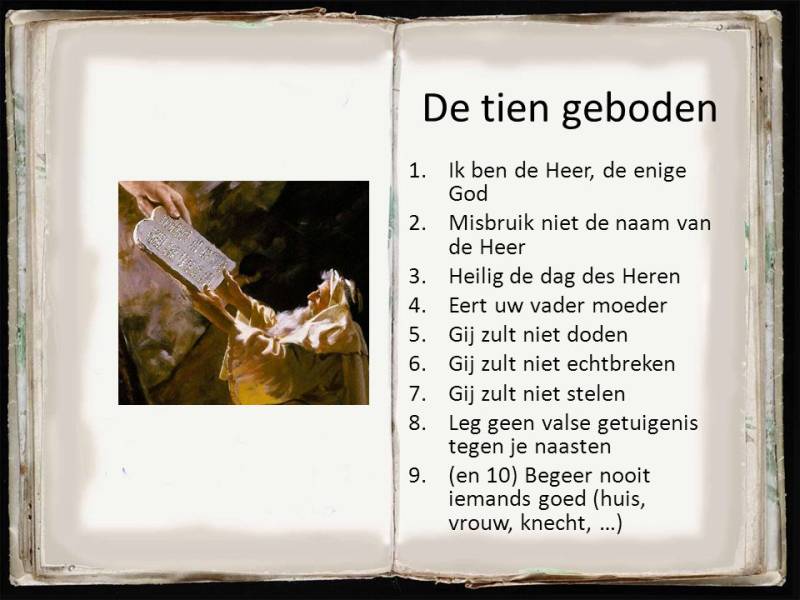 Ik denk dat de meeste van de ouderen onder ons, de tien geboden nog kunnen opnoemen. Wij werden ermee opgevoed, die in vragen van de Catechismus ons werden bijgebracht. Ik denk dat de meeste jongeren van nu moeite zouden hebben om ze op te noemen.