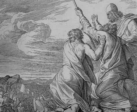 “ Zolang Mozes zijn armen opgeheven liet, waren de Israëlieten aan de winnende hand. Maar liet hij zijn armen zakken, dan won de vijand Amalek. Tenslotte werden Mozes’ armen moe. Ze haalden een steen waarop hij kon zitten. Aaron en Chur ondersteunden zijn armen, elk aan een kant. Tot zonsondergang, bleven zijn armen omhoog. En Jozua versloeg Amalek en zijn leger met het zwaard……De handen omhoog naar de Heer ! “