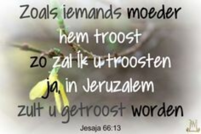 God zegt tegen mij en jou en jou:zoals een moeder haar kind zoogt en op schoot neemt, warm en wel ….zoals een moeder Troost …Ik ben dicht bij je, zo ben ik als God dicht bij Jou….DENK je daar aan, Durf je Jezus te vragen…laat ons het even voelen….