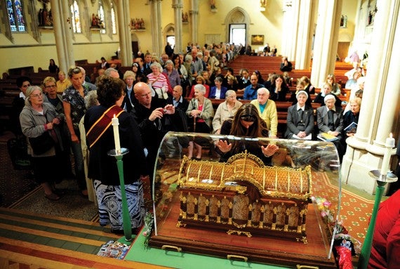 Haar povere resten, in een ‘reisvaardige’ schrijn, trekken mensen van overal. Ongeacht ras of taal. Maar ook van welke ‘eerdere’ vorming dan ook. Of juist mensen die in eerste instantie wat teruggetrokken aan die relieken voorbijgaan, even aanraken... en toch nadenken. Je zou dat eigenlijk eens van dichtbij moeten zien gebeuren. Eens zien en ervaren....